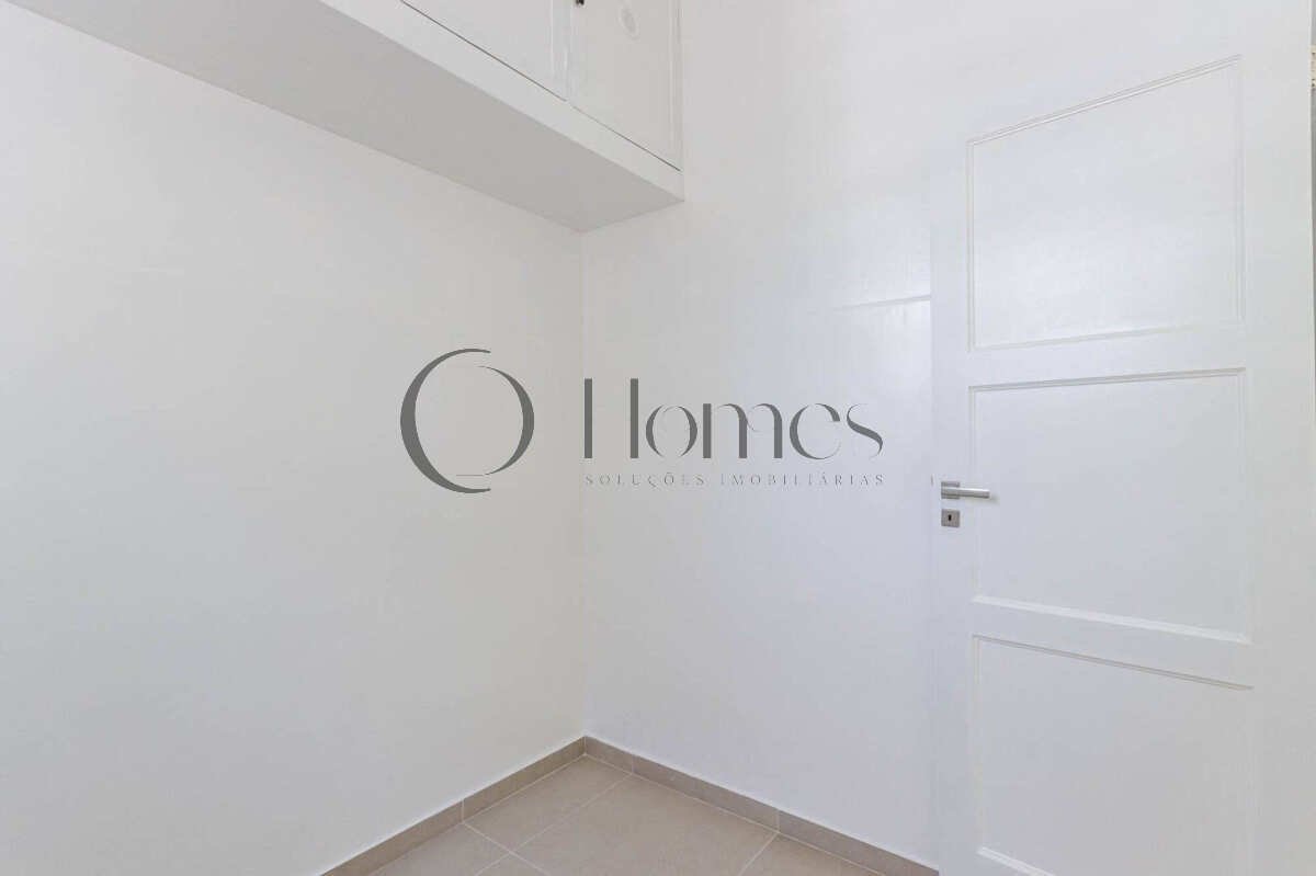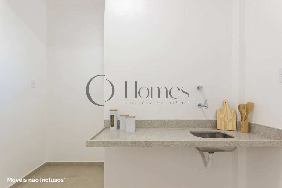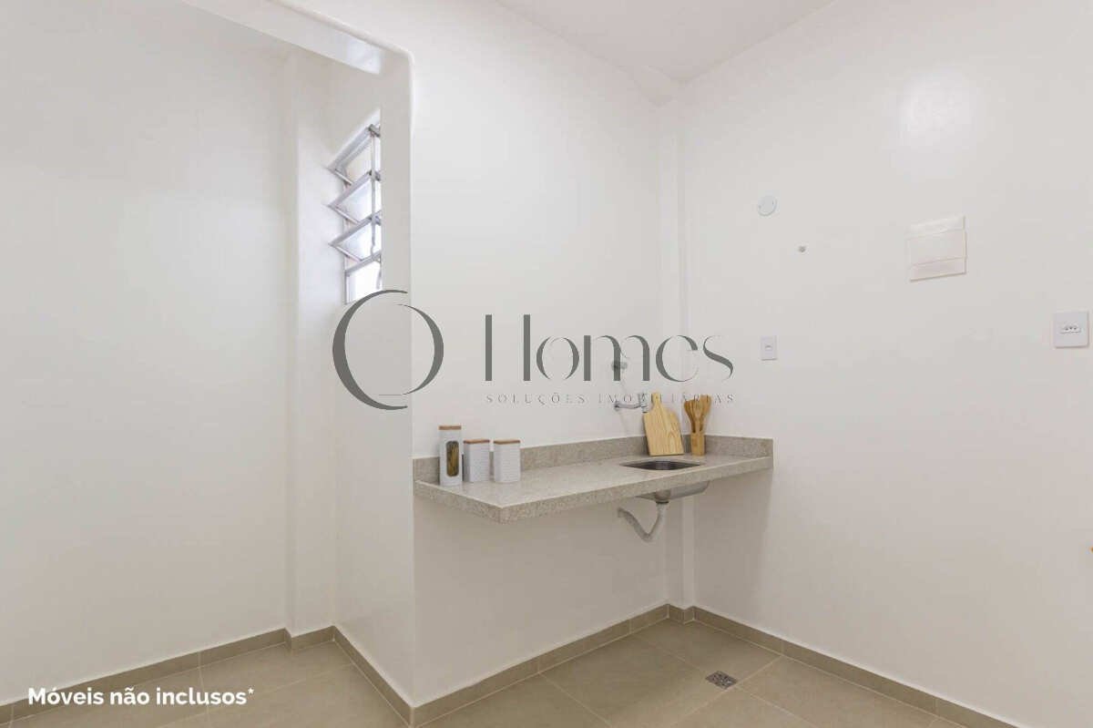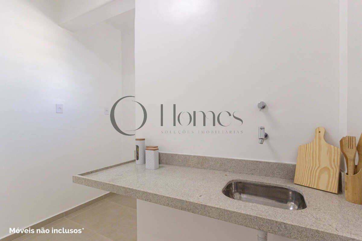 Cozinha compacta integrada à área de serviço e despensa.