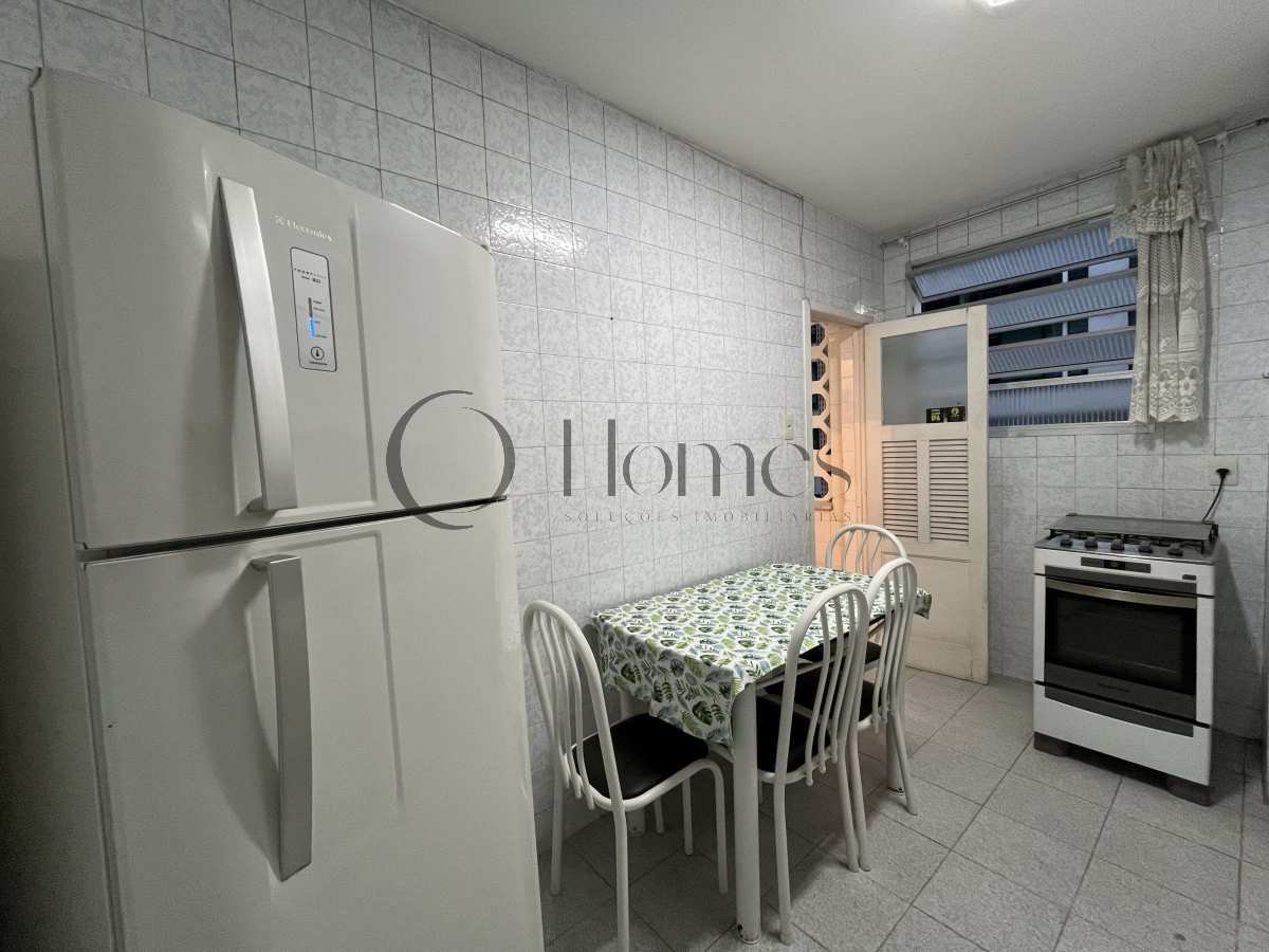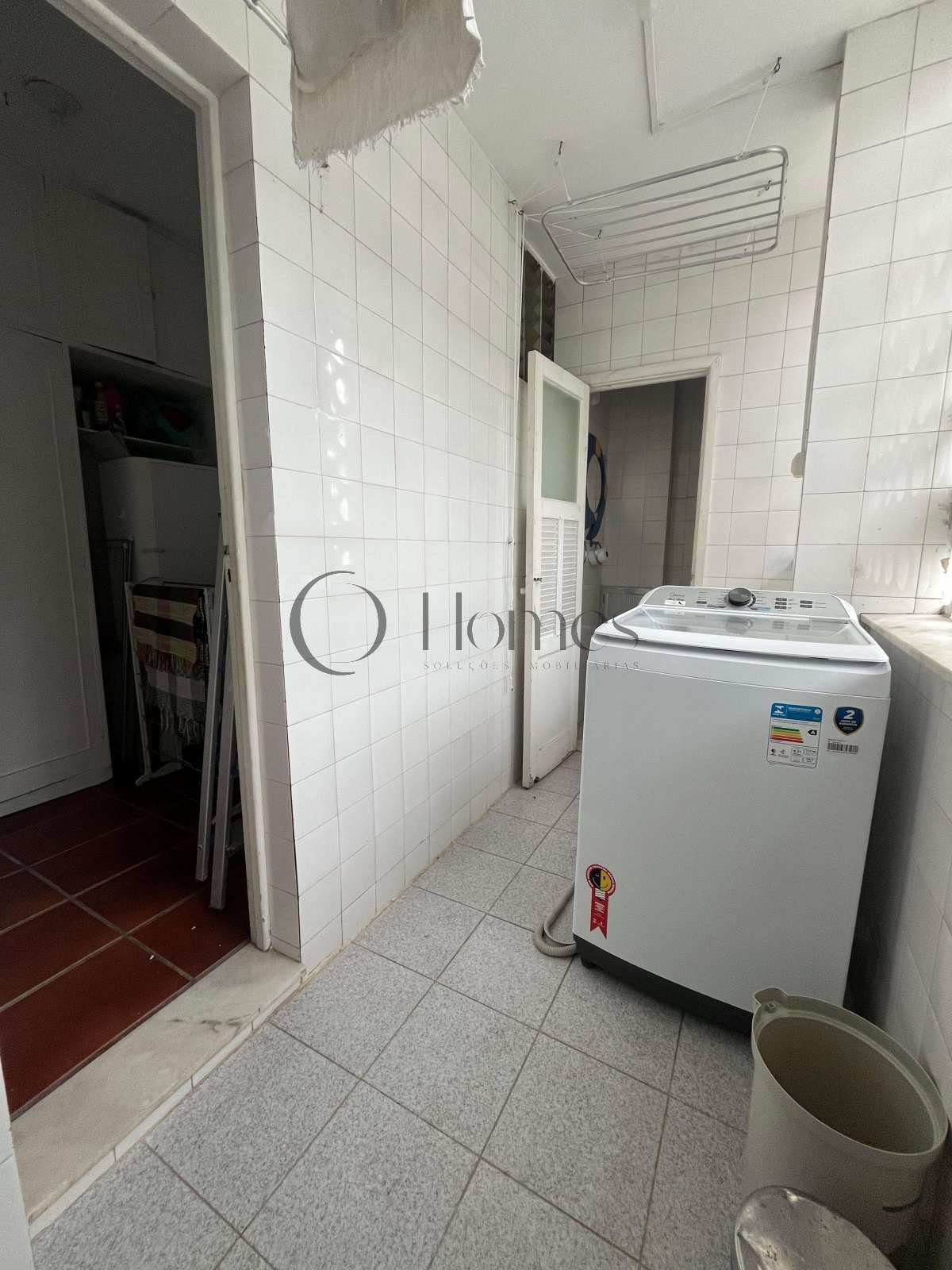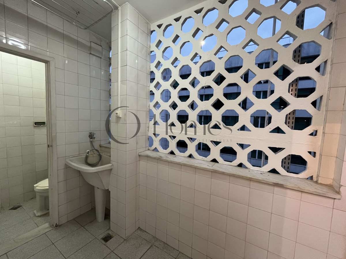 A unidade possui banheiro social, lavabo, cozinha completa e dependência de serviço com máquina de lavar roupas.